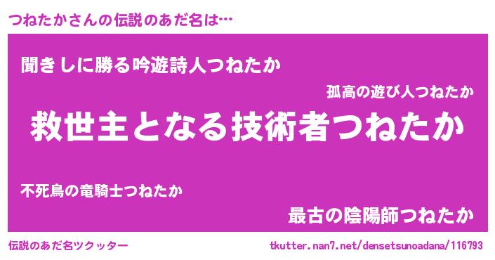 | 男性向けラノベタイトル風あだ名 | 『Re:つねたかから始める異世界生活』 |