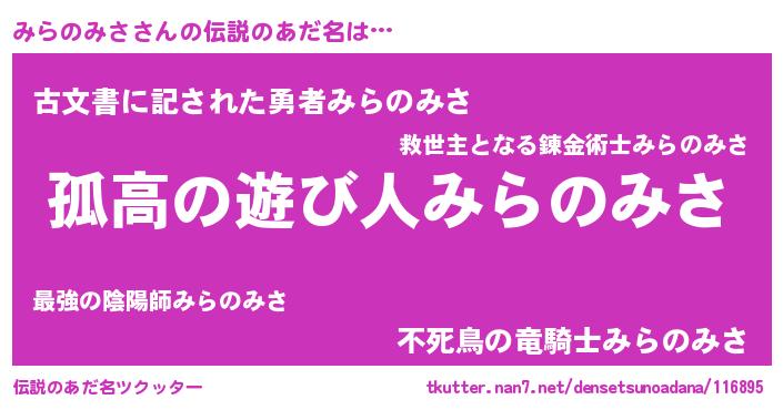 | 女子向けラノベタイトル風あだ名 | 『みらのみさは平凡を望む』 |