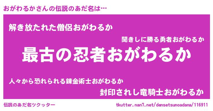 | 女子向けラノベタイトル風あだ名 | 『おがわるか伯爵の花嫁』 |