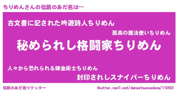 | ヒーロー風カッコイイあだ名 | 『ウルトラちりめんマン』『ネオチリメン』 |