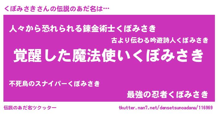 | 胡散臭い通販商品みたいなあだ名 | 『あなたにだけ特別に提供する100年もののヴィンテージワイン…その名も「くぼみさき」』 |