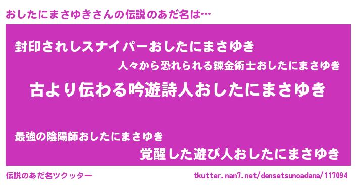 | ヒーロー風カッコイイあだ名 | 『ネオオシタニマサユキ』『暗黒騎士オシ』 |