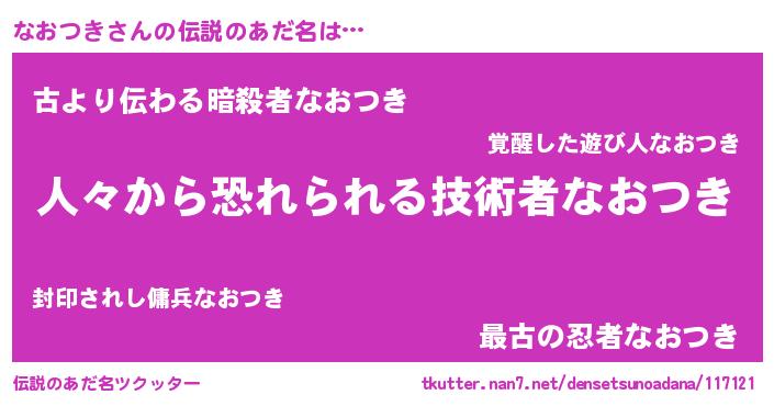 | 男性向けラノベタイトル風あだ名 | 『おまえをオタクにしてやるから、俺をなおつきにしてくれ! 』 |