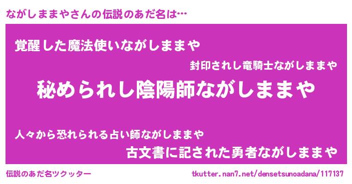| 肩書あだ名 | 『ながしままや総統』『ながしままや中佐』 |