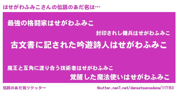| 男性向けラノベタイトル風あだ名 | 『この素晴らしい世界にはせがわふみこを!』 |