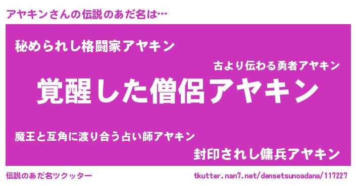 | 男性向けラノベタイトル風あだ名 | 『アヤキンの嫁は女の子じゃないと思った?』 |