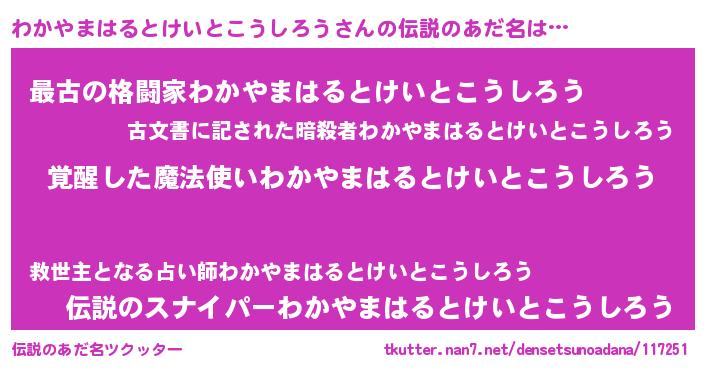 | ポケモン風あだ名 | 『ヒワカヤマハルトケイトコウシロウ』 |