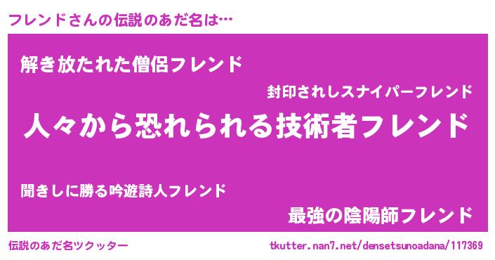 | 男性向けラノベタイトル風あだ名 | 『おまえをオタクにしてやるから、俺をフレンドにしてくれ! 』 |