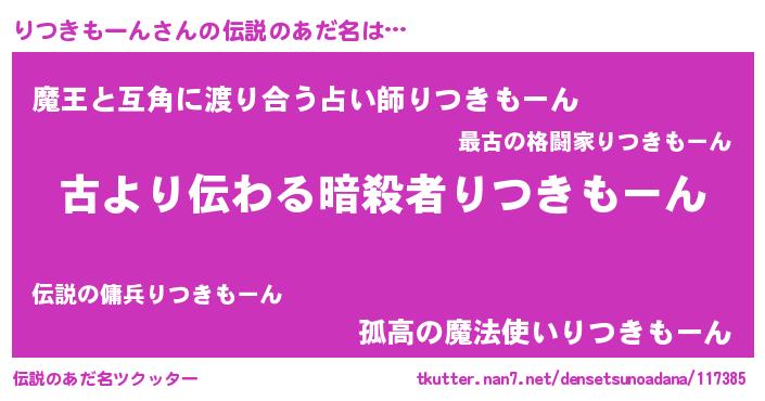 | 男性向けラノベタイトル風あだ名 | 『りつきもーんという概念が存在しない退屈な世界 』 |