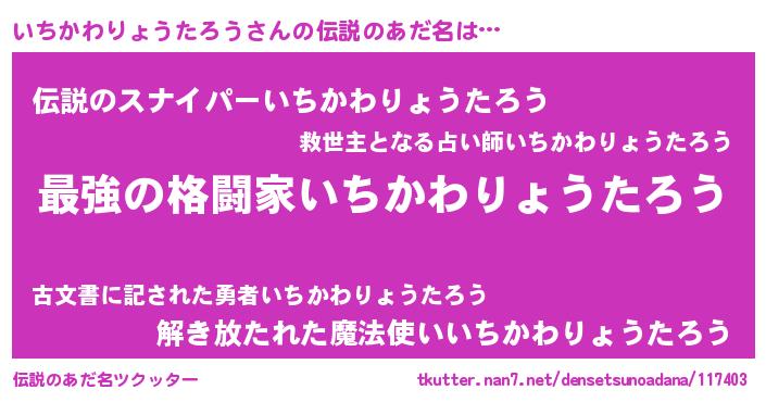 | 男性向けラノベタイトル風あだ名 | 『いちかわりょうたろうに滅ぼされるだけの簡単なお仕事です』 |