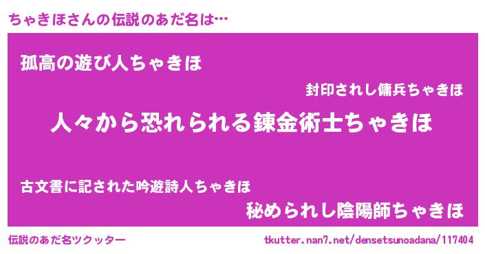 | 男性向けラノベタイトル風あだ名 | 『おまえをオタクにしてやるから、俺をちゃきほにしてくれ! 』 |