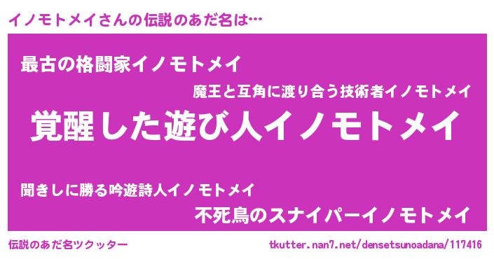 | ヒーロー風カッコイイあだ名 | 『天弓騎士イノ』『スーパーイノモトメイ』 |