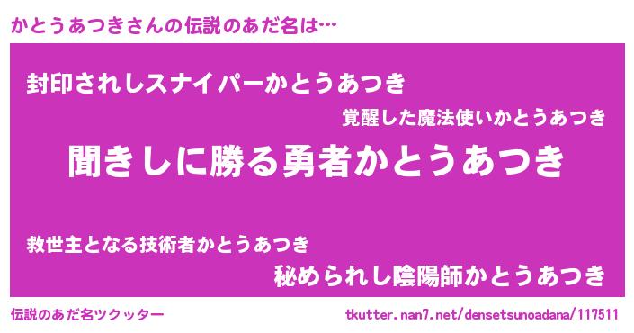 | 意味不明あだ名 | 『永久保存かとうあつき』 |