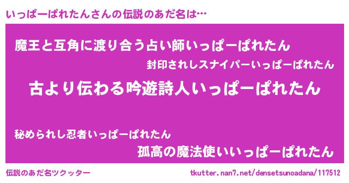 | 男性向けラノベタイトル風あだ名 | 『いっぱーぱれたんという概念が存在しない退屈な世界 』 |