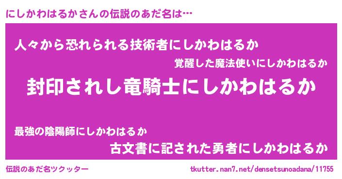 | 男性向けラノベタイトル風あだ名 | 『ニシカワハルカアートオンライン』 |