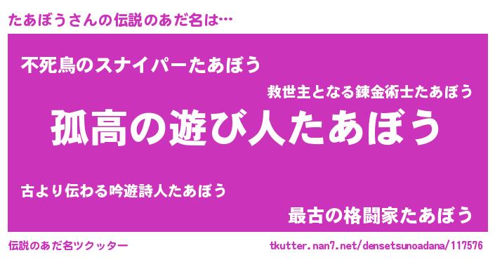 | ヒーロー風カッコイイあだ名 | 『魔戒騎士タア』『スーパータアボウ』 |