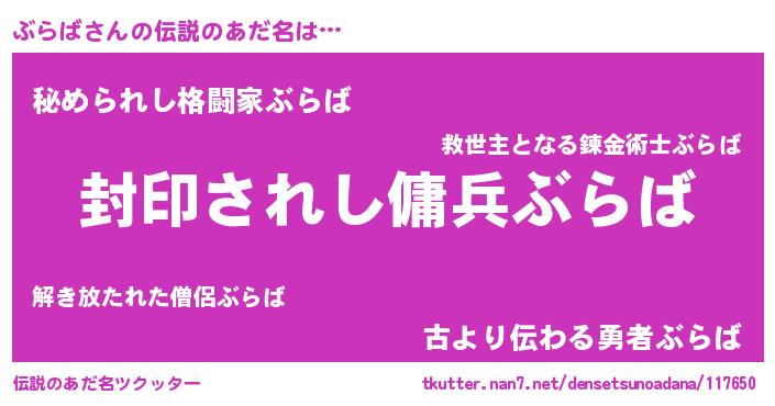 | 男性向けラノベタイトル風あだ名 | 『Re:ぶらばから始める異世界生活』 |