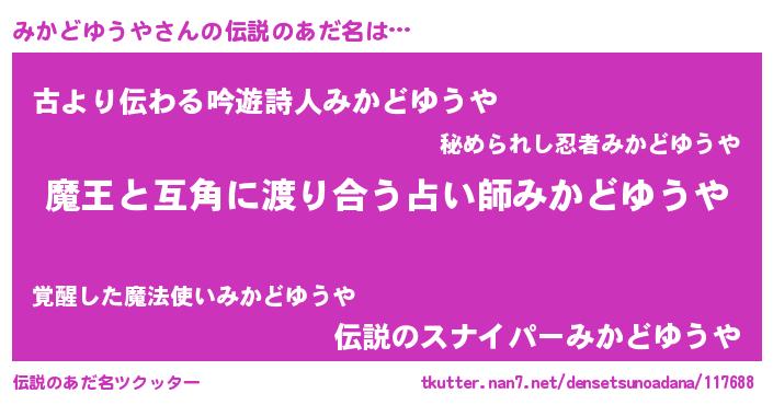 | 男性向けラノベタイトル風あだ名 | 『魔弾の王とみかどゆうや』 |