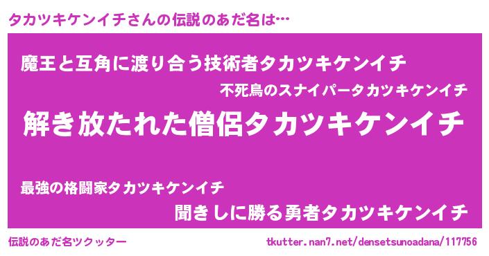 | 男性向けラノベタイトル風あだ名 | 『転生したらタカツキケンイチだった件』 |
