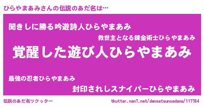 | 胡散臭い通販商品みたいなあだ名 | 『あなたにだけ特別に提供する世界で10本だけ現存している希少なブランデー…その名も「ひらやまあみ」』 |