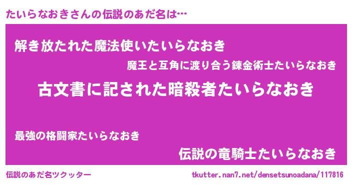 | 男性向けラノベタイトル風あだ名 | 『Re:たいらなおきから始める異世界生活』 |