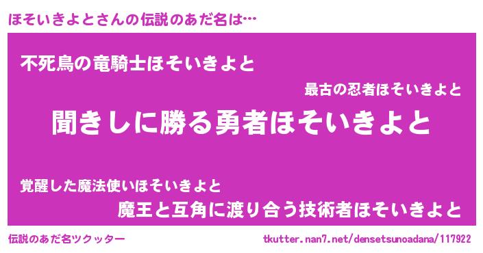 | 胡散臭い通販商品みたいなあだ名 | 『絶対に幸福をもたらす水素水…その名も「ほそいきよと」』 |