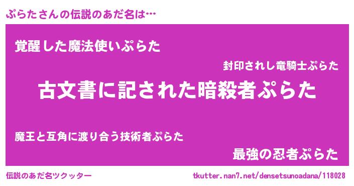 | ヒーロー風カッコイイあだ名 | 『ネオプラタ』『天弓騎士プラ』 |