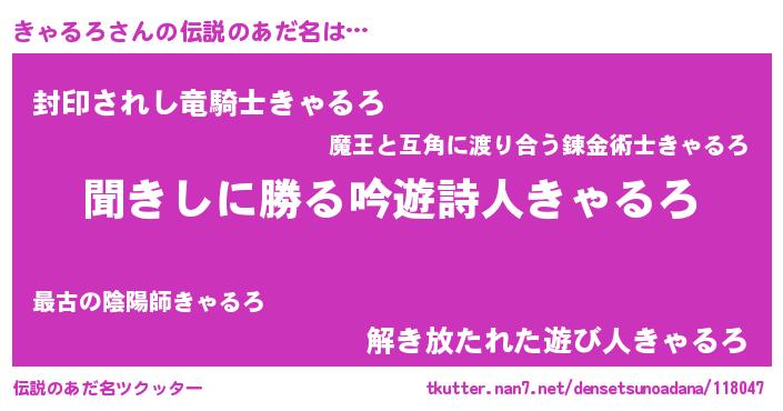 | 男性向けラノベタイトル風あだ名 | 『魔弾の王ときゃるろ』『きゃるろの憂鬱』 |