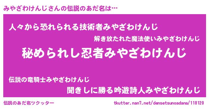 | ヒーロー風カッコイイあだ名 | 『仮面ミヤダー』『ネオミヤザワケンジ』 |