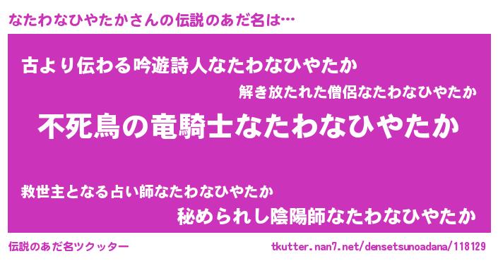 | 女子向けラノベタイトル風あだ名 | 『なたわなひやたか姫と円卓の騎士』 |