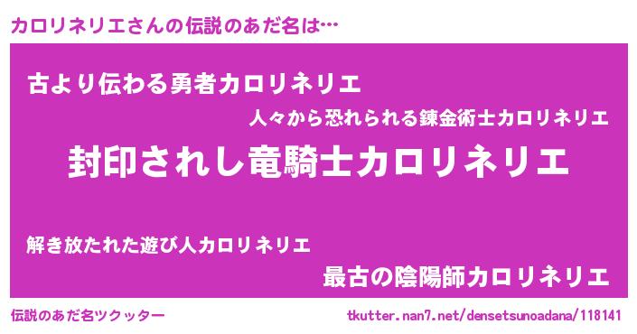 | 男性向けラノベタイトル風あだ名 | 『カロリネリエアートオンライン』 |