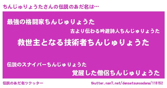 | ヒーロー風カッコイイあだ名 | 『慈愛の使者ちんじゅりょうた』 |