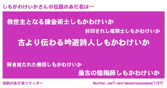| 女子向けラノベタイトル風あだ名 | 『しもかわけいかアンティーク』 |