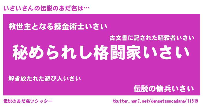 | 女子向けラノベタイトル風あだ名 | 『いさいの雑貨屋さん』『いさい恋絵巻』 |