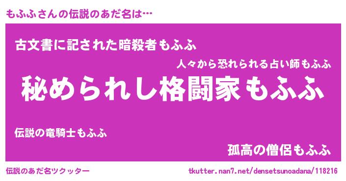 | ヒーロー風カッコイイあだ名 | 『超時空戦士モフフ』『仮面モフダー』 |