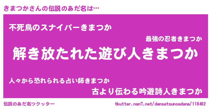 | ヒーロー風カッコイイあだ名 | 『ウルトラ戦士キマツカ』『幻影騎士キマ』 |