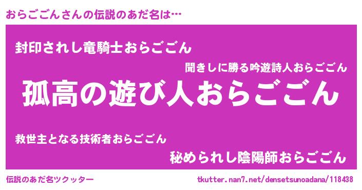 | 意味不明あだ名 | 『自称おらごごん』『ペロリンおらごごん』 |