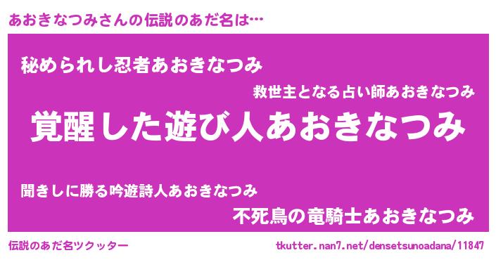 | ポケモン風あだ名 | 『ヒアオキナツミ』『アオキダネ』 |