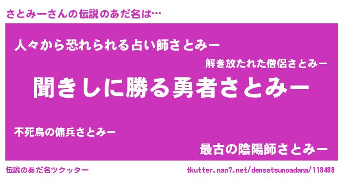 | 女子向けラノベタイトル風あだ名 | 『異世界で失敗しない100のさとみー』 |