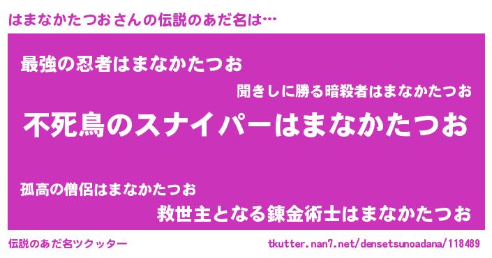 | 意味不明あだ名 | 『住所不定無職はまなかたつお(91歳)』 |