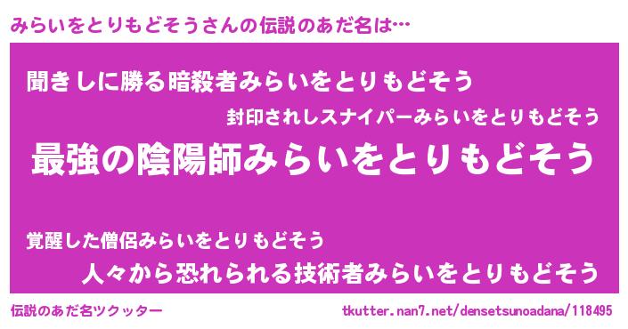 | ヒーロー風カッコイイあだ名 | 『最強戦士ミライヲトリモドソウ』 |