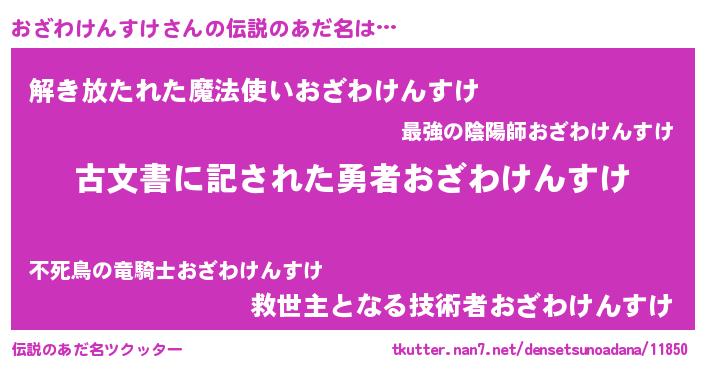| 男性向けラノベタイトル風あだ名 | 『おざわけんすけ~年齢イコール彼女いない歴の魔法使い~』 |