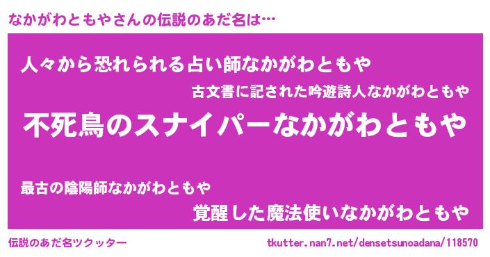 | 胡散臭い通販商品みたいなあだ名 | 『モテモテ間違いなし霊験あらたかなお札…その名も「なかがわともや」』 |