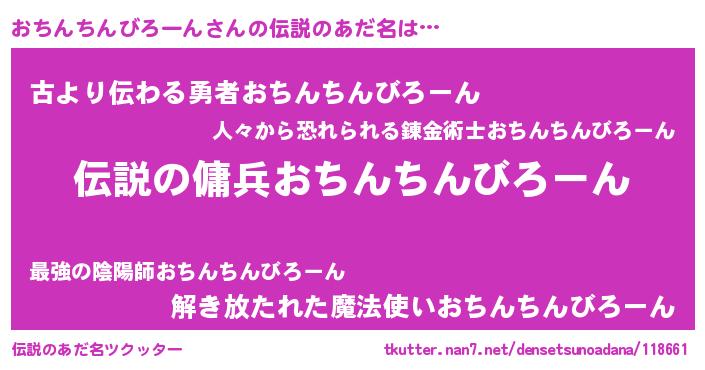 | 男性向けラノベタイトル風あだ名 | 『おちんちんびろーんの憂鬱』 |