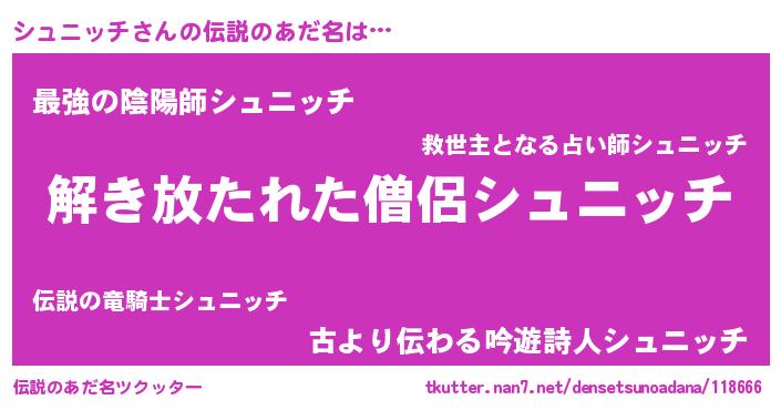 | ヒーロー風カッコイイあだ名 | 『銀牙騎士シュ』『ネオシュニッチ』 |