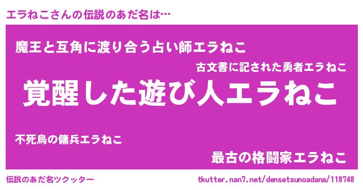 | 男性向けラノベタイトル風あだ名 | 『エラねこの嫁は女の子じゃないと思った?』 |