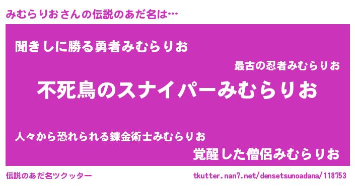 | 意味不明あだ名 | 『住所不定無職みむらりお(95歳)』 |