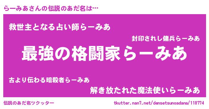 | ヒーロー風カッコイイあだ名 | 『ウルトラらーみあマン』『幻影騎士ラー』 |