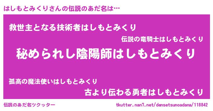 | 意味不明あだ名 | 『住所不定無職はしもとみくり(77歳)』 |