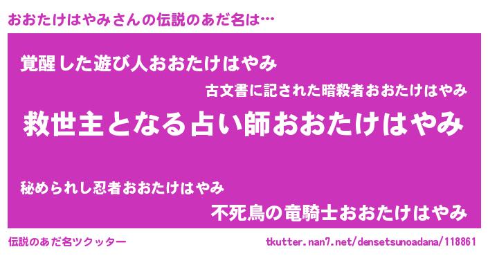 | 意味不明あだ名 | 『住所不定無職おおたけはやみ(59歳)』 |